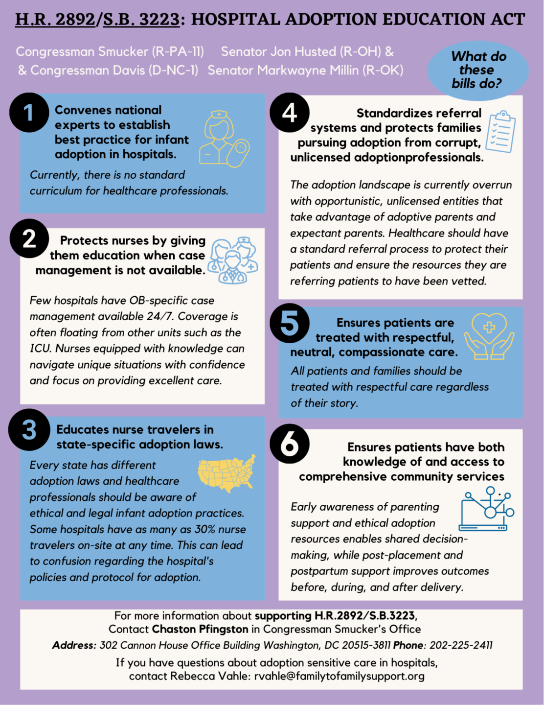 Get involved inĀ House Resolution 2892/Senate Bill 3223: Hospital Adoption Education Act!Ā This legislation funds education in adoption-sensitive care in hospitals across the country.Ā Access and download additional materials below.